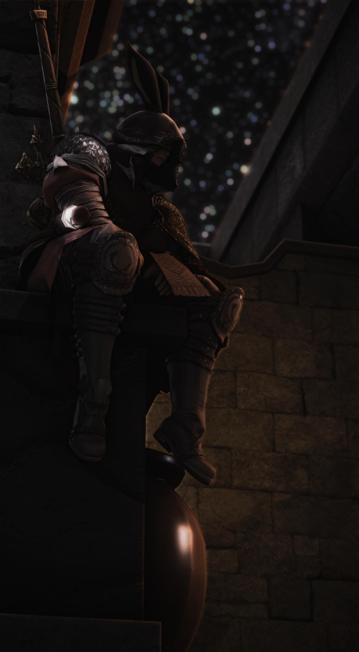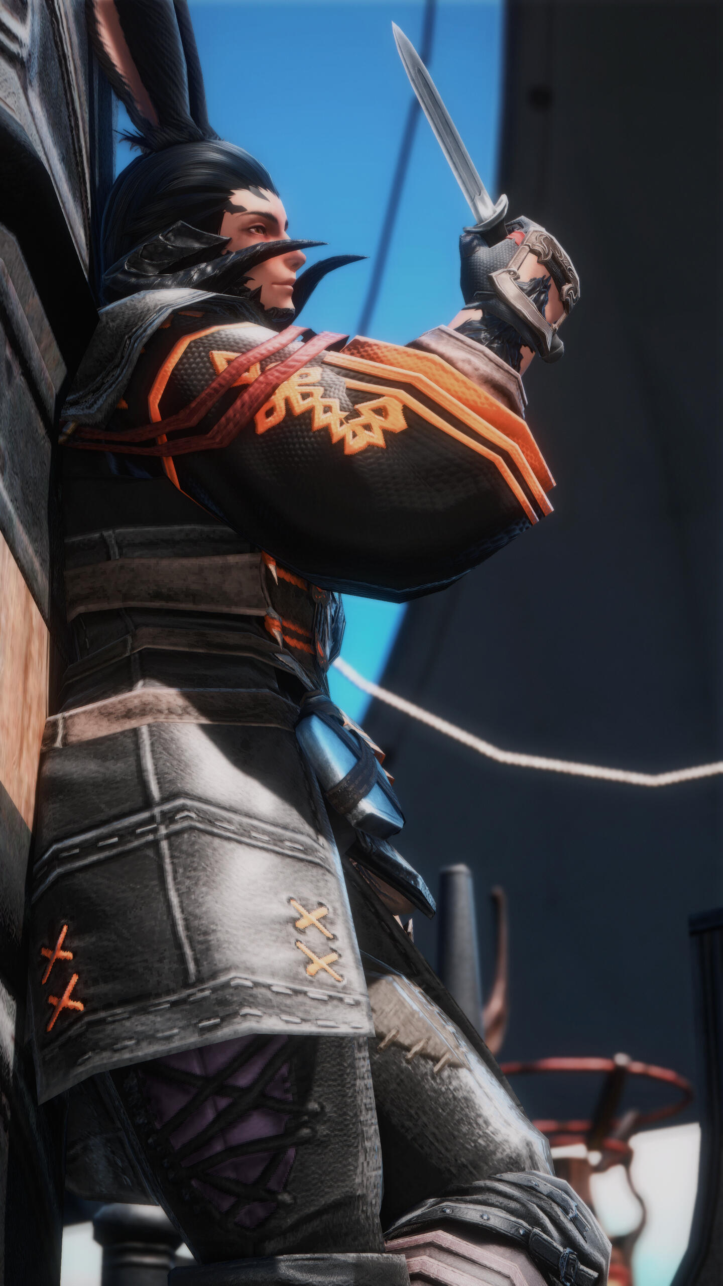 What felt like a few moments later, Bosco awoke on the deck of a ship, and his head pounded even harder than before. He was flat on his back. He coughed and sputtered as he tried to lean up. The people above him looked as if they’d just seen a ghost. Perhaps they had. He couldn’t get answers on what happened - the chaos was too much for people to comprehend. One thing was certain: he had no home to return to.From then on, the sea was the only life Bosco ever knew. Luckily, freight shipping was still highly desired work, so he never wanted for much as he continued to grow into an adult. The ships took him all over the world, where he mingled with all walks of life. Once, another sailor taught him how to pick locks, and the very first thing Bosco did was pick his way into the cargo hold. He learned it was a safe, quiet place to hide away in, and on many ships he'd spend days lost in the piles of merchandise, sometimes simply falling asleep.While docked ashore in Eorzea, Bosco ran into a weathered Viera who knocked him off his feet. The Viera skidded to a stop and immediately turned back to help Bosco back up. Wordlessly, the Viera kept running, and Bosco noticed he was pursuing a cloaked figure. Quiet as a mouse, Bosco curiously treaded behind them. He tracked them all the way to a corner of town, where he arrived just in time to witness the Viera end the figure's life.When all was calm, to Bosco’s shock, the Viera turned directly to where he hid. It was then he made offer to Bosco, where if he wanted, he could put his skills to use to help weaken the Empire. The concept made him ache in a way he never had before. Without a second thought, he accepted.